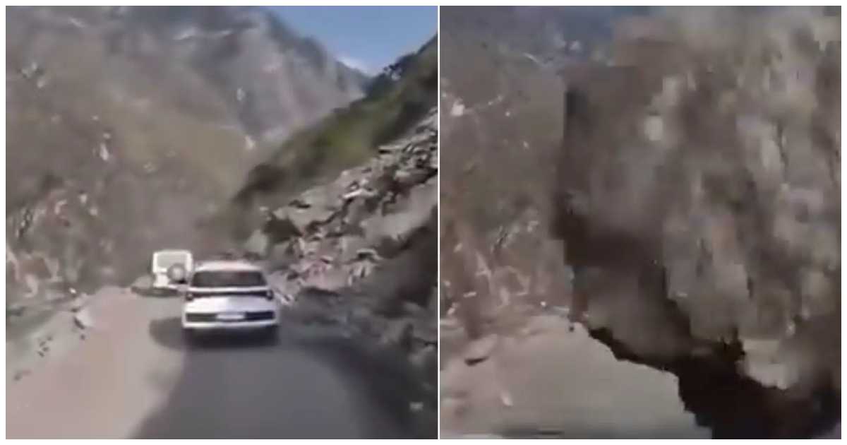 ভিডিওতে দেখা যায়, পাহাড় থেকে গড়িয়ে পড়া পাথরখণ্ডটি গাড়ির সামনের অংশে আঘাত করে নদীতে গিয়ে পড়ে।