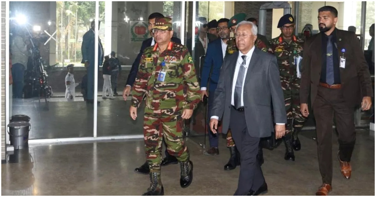 নির্বাচন ভবনে রবিবার দুপুর ১২টার দিকে প্রবেশ করেন সেনাবাহিনীর প্রধান জেনারেল ওয়াকার-উজ-জামান, নৌবাহিনীর প্রধান অ্যাডমিরাল মোহাম্মদ নাজমুল হাসান এবং বিমান বাহিনীর প্রধান এয়ার চিফ মার্শাল হাসান মাহমুদ খান। পরে তারা বৈঠকে অংশ নেন।